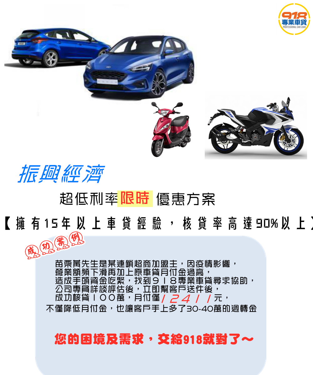 振興經濟 918與你攜手渡難關~ 超低利率限時優惠方案 申貸30萬 月付只要3780元起 申貸50萬 月付只要6313元起 申貸100萬 月付更只要12626元起 只要你有汽車或機車,就算仍在貸款中,一樣通通皆可貸~! 立即填單